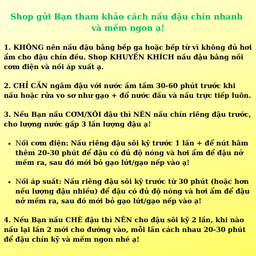 Cách dùng: Rửa sạch và nấu ngay (không cần ngâm), dùng để nấu cháo, nấu chè, làm bột ngũ cốc, rang uống trà, làm nhân bánh...rất thơm ngon và bổ dưỡng. Shop gửi Bạn cách nấu đậu chín nhanh và mềm ngon ạ!